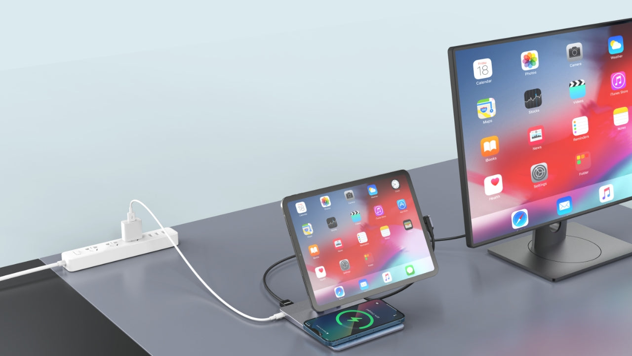 with Wireless Charging, Multiple USB A Expansion Ports, HDMI, Card Reader, and PD Input. Turning your Type-C iPad into a work station in seconds.
